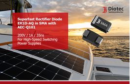 The ER1D-AQ by Diotec Semiconductor is a superfast recovery rectifier, qualified to AEC-Q101 and assembled in a DO-214AC/SMA package. It is an output rectifier in a maritime DC/DC converter, transforming the 24 V battery level to the 5 V required from the onboard electronics. Its superfast switching time reduces power losses, the 200 V of reverse voltage provides a high safety margin, and the qualification according to AEC-Q101 ensures outstanding reliability.